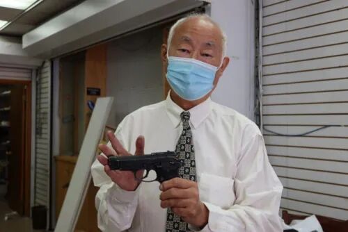 古角说,“我一生都在尝试中摸索机会,苦难会让一个人越挫越勇,而这种勇并非匹夫之勇,而是大敌当前的临危不乱,这种信念给我希望,也一直带我前行。”关门当天,还有慕名而来的粉丝前来拍照,与这家百年老店告别。 古角和他随身佩戴的短枪。(图片来源:美国《世界日报》/张晨 摄)