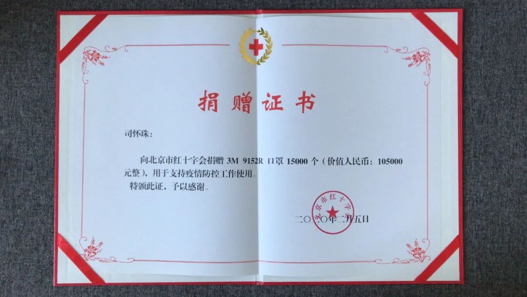 图为捐赠证书。受访者供图。 后来,在国内朋友和大使馆的帮助下,这批物资捐给了北京的西苑医院。该医院支援武汉的医疗队成员就曾戴着司怀珠捐赠的口罩去了前线,“他们当中没有一人感染,这让我感到很宽慰。”
