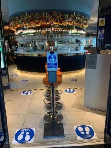 快乐小羊火锅店的负责人表示,在纠结了多天后,他们的团队一致选择重新营业,并采取了一系列措施应对解封后的新政。他们设置了客人的进门注册系统。在顾客较多的情况下,可以扫二维码排队,这样可以通过手机短信提前通知客人就餐,避免了顾客在前门聚集等待的情况出现。 快乐小羊在门口设置了独立免接触的感应式洗手液,并贴了地贴进行引流。(受访者提供)