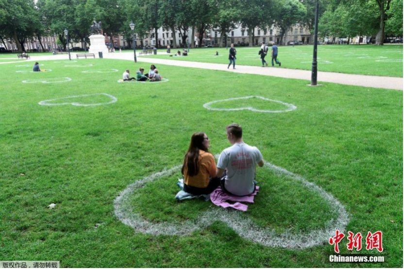 虽然自5月以来,英国已逐渐放宽封锁措施,但为了守住几个月以来的防疫成果,旅英华侨华人们并未松懈,工作和生活中仍然自觉严格遵守各项防疫规定。 旅英华人柏玟所在的公司对复工很谨慎,员工都尽量在家办工,他近三个多月就出了两次门。面对多出来的“独处时间”,他选择“修养身心”,每天规律健身、读书,还报了网课,学习自己感兴趣的室内设计。晚上和朋友电话聊天时,大家还会交流最近看了什么、准备学些什么。 柏玟坦言,居家一两个月的时候,也会经历一些倦怠和烦躁,这时更要细心发掘生活中的美。他会观察公寓外面的一棵树,看它3月时干枯的枝桠如何逐渐抽出新芽,到7月已是一片嫩绿。 在英国读研的卢鑫也觉得,居家期间时间充裕,自己做饭,生活习惯更健康规律。卢鑫加入了一个旅英华侨华人组建的“中华小当家”美食交流群,大家在群里晒出菜品、按时“打卡”,交流心得,甚至远程教群友烹制自己的家乡菜。在厨房的烟火气中,多少冲淡了居家防疫的无奈与枯燥。 因为幼儿园、学校的关闭,很多华人家庭都在照顾孩子上倾注了更多的时间精力。疫情期间,改为线上授课的大学讲师李博也多了和年幼的女儿相处的时间。“解封”后,他常带女儿去海边散步。 资料图:当地时间2020年7月8日,英国布里斯托尔,艺术家在皇后广场的草地上画出心形图案,敦促人们保持社交距离。
