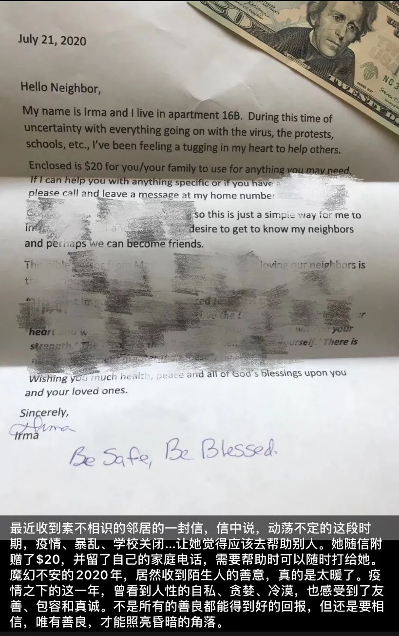 在美国生活了近6年的小雨,最近收到了一封来自邻居的信。 信中说:“动荡不定的这段时间,疫情、暴乱、学校关闭,让我觉得应该去帮助别人……” 邻居还留了自己的电话,说有需要可以随时联系她。 信封里还放了20美元现金。 而小雨并不认识这位邻居。 小雨收到信后发布的朋友圈截图。 “魔幻不安的2020年,用这种方式收到陌生人的善意,真的太暖了!”小雨说。