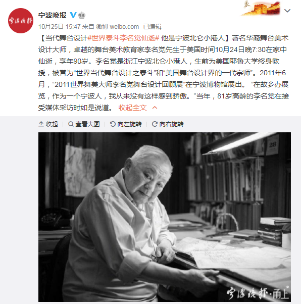 据美国当地媒体报道,当地时间10月23日,被誉为“世界当代舞台设计之泰斗”和“美国舞台设计界一代宗师”的著名华裔设计师李名觉(Ming Cho Lee)在美国病逝,享年90岁。 资料图:美国华人博物馆2016年为李名觉举行回顾展,图为李名觉(右)和妻子贝蒂(左),及策展人。(美国《侨报》/林菁 摄) 对于喜爱舞台艺术的人来说,李名觉这个名字可以说是“如雷贯耳”,而对于全世界而言,李名觉是一个时代舞台艺术的象征…… 出身名门 襁褓中便与舞台结缘 李名觉祖籍宁波,1930年10月3日出生于上海,父亲和母亲都来自显赫之家,母亲唐瑛是上海名媛和著名交际花,与陆小曼并称“北陆南唐”,而他的父亲李祖法1919年毕业于耶鲁大学。 《宁波晚报》微博关于李名觉去世的报道截图 李名觉与舞台的缘分,其实在他襁褓之中就已经开始了。因为母亲唐瑛酷爱昆曲,所以周末的时候经常带着李名觉去剧院看戏,童年的戏剧熏陶,为他后来选择舞台设计埋下了种子…… 1948年,李名觉随父亲移居香港,1949年移居美国。19岁的李名觉在那时入读了洛杉矶的西方学院。 从在南加州大学学习电影,到后来决定学习舞台设计,这一切都与他小时候同母亲一起看戏的经历有关。 年轻时代的李名觉(右三)。(视频截图自耶鲁大学官网) 在上海的时候,李名觉曾经拜师于张大千,学习国画两年,到了美国后,又开始学习抽象印象主义绘画,中西方绘画功底让他做起舞台设计如鱼得水,很快就有了自己的作品。 事业起步 在纽约遇伯乐指路 1954年,李名觉从学校毕业后,便直奔纽约,而他的事业,也从纽约开始…… 初到纽约的李名觉举目无亲,为了敲开通向舞台设计的大门,他便找到曾在自己学校讲座的世纪灯光公司的经理埃迪·柯克帮忙。也就是埃迪·柯克,把李名觉推荐给了美国二战后最著名的舞台设计大师乔·梅尔齐纳。 此后8年,李名觉一直担任梅尔齐纳和其它舞台设计师的助理,积累了很多经验。 年轻时代的李名觉(右三)。(视频截图自耶鲁大学官网) 后来,李名觉受聘为纽约“莎士比亚戏剧节”设计舞台,终于作为一个舞台设计师,开始展现自己的才华。 著名的纽约歌剧院、大都会歌剧院、旧金山歌剧院、玛莎·葛兰姆(Martha Graham)舞蹈团都会请他做舞台设计。李名觉的舞台设计作品有百老汇、芭蕾舞和古典及现代剧,如《奥塞罗》、《麦克白》、《伊蕾克特拉》、《等待戈多》及《喜福会》等,作品总共超过200个。 李名觉的舞台设计作品。(图片来源:美国《侨报》) 从1969年起,李名觉开始执教于耶鲁大学戏剧学院的舞台设计系,从1979起担任共同系主任,在这期间培养了一大批舞美设计师。 获奖无数 创造立体舞台世界 在追求艺术的道路上,李名觉永远是孜孜不倦、执着不懈的。也正是因为有这种精神,才让他的舞台设计让人过目不忘,并也因此获奖无数。 每次设计作品时,李名觉通常会先读一遍剧本,或者观看歌剧、芭蕾的排练,得到一些大致的感受后,便开始用草图进行构思。一直到有了构想之后,他才会再度钻研剧本或音乐。 舞台设计成稿之后,他还会亲自去实地考察,以求证细节的真实性。制作模型的时候,李名觉要求也十分苛刻,他的助手如果制作模型时出现了哪怕一点点的误差,李名觉就会要求推倒重做。 李名觉舞台设计作品。(视频截图自耶鲁大学官网) 每一部戏的设计,李名觉都会以同样的基础制作5种不同版本的模型,以修改自己的思路,并供导演选择。 为了让演员真切地“活”在舞台设计的空间里,他以真材实料的木头与金属,创造出以雕塑意趣为主的布景,这使美国的舞台设计从最初的二度空间发展为雕塑型的立体形式。这一设计潮流,影响了整个世界的舞台。 李名觉说:“现实生活的场景就是立体的,只有用立体的、雕塑式的方式来表达,才能接近于现实。” 李名觉舞台设计作品。(视频截图自耶鲁大学官网) 1982年,李名觉凭借为阿伦纳剧院演出的《K2》的设计(用泡沫堆了一座高达12米的蔚为壮观的立体山),捧得了百老汇声誉最高的“托尼奖”。而在华裔设计师中,李名觉是最早获此项殊荣的设计师。 此后,他还获得美国艺术界国家最高奖项“国家艺术奖章”,“美国总统杰出贡献奖”以及“托尼终身成就奖”和五个荣誉学位。 李名觉和英国的科尔泰、捷克的斯沃博达并称世界舞台美术设计三大巨头,雄踞美国10大舞台设计师之首,而且,这10大设计师中,有6位曾是他的学生或助手,此外,世界上很多著名舞美设计师都表示受到过他的启迪或影响…… 如今,大师已逝,他的对舞台艺术的贡献,将永远被热爱舞台的人铭记! 资料来源:中国新闻网、美国《侨报》等 编辑:曾小威 |