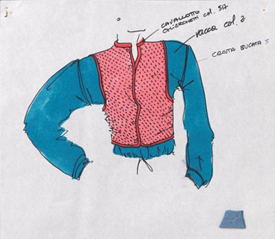 I bozzetti disegnati su carta, con pennarello, china e lapis, hanno la particolarità di essere quasi sempre accompagnati dall’inserto di tessuto o di pelle utilizzato per il capo.