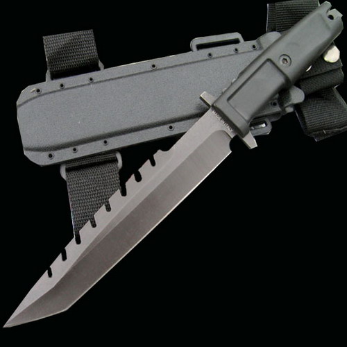 由鼎鼎大名的Strider设计制造,硬度HRC58-60 Strider设计的刀向来为特种兵所钟爱,刀型剽悍,品质极其优秀,几乎可以应付任何恶劣环境下的使用,由于Strider选用的ATS34钢材,以及卓越的热处理工艺,刀身韧性及耐久度俱佳,甚至有人把他当做撬杆使用。刀身上的防反光涂层,可以避免在行动中被敌人发现。 此刀国内基本无货,只在少数收藏家手里能找到。 由著名的Strider公司出品的格斗利器-猛虎刀。它的形状十分怪异,模样奇怪的甚至给人一种恐怖感。刀刃下方的半圆环部位是手指卡位,刀身有护手隔,上侧的刀刃是直线型的假刃,这样的设计对削掉粘附在船底上的贝壳等是非常有效的,刀背上方是背齿。把食指放在刀柄的前端,突刺也好、剜割也好都很得心应手,使用自如。既能作为实用功能刀使用,又能作为战刀突刺,尤其更为有利下角突刺。