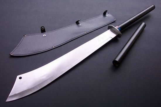 美国开山刀:全长58cm;刃长45cm;产地美国;类型:野战刀;刃宽5.5cm;刃厚0.25cm;材质;高碳工具钢。