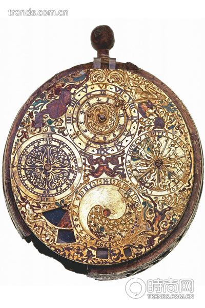1600年制造的一个拥有闹钟和日历功能的Ferlite怀表。