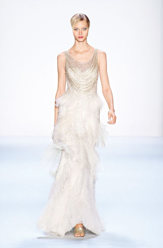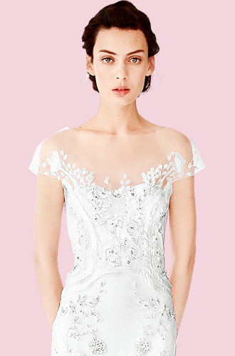 Oscar de la Renta的这款透明薄纱一字领婚纱采用半透明领设计,领子上的花样设计仿佛从婚纱上攀岩而上的树叶和花朵,既冲出枝头又结根在树干这个生命的源泉上,使婚纱整体上非常有生命力。