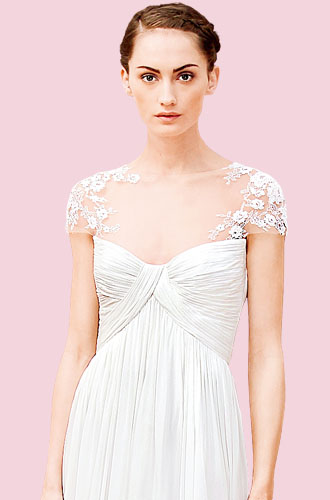 与前两款半透明领婚纱不同,Monique Lhuillier桑蚕丝雪纺绸婚纱完全是用肩部秀在透明薄纱上的花样来点缀整体上是雪纺绸的婚纱。双肩上的花朵仿佛从天上降下,为新娘增添婚礼的祝福。