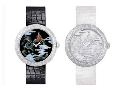 左:香奈儿Mademoiselle Priv Coromandel 表面大明火珐琅套表2013年首度与品牌旗下刺绣工坊Maison Lesage 合作,运用多彩丝线融合针画工艺技术绣制表面,并荣获2013年日内瓦钟表大赏-年度最佳艺术工艺奖,今年Mademoiselle Priv ,新款腕表除了既有的珐琅彩绘表现手法外,更加入了珍珠母贝雕刻与23K黄金精雕工艺,立体化的呈现将品牌的腕表精髓发扬光大,也奠定了CHANEL腕表致力于专业制表艺术殿堂的决心。右:香奈儿Mademoiselle Priv Coromandel 表面珍珠母贝雕刻腕表套表