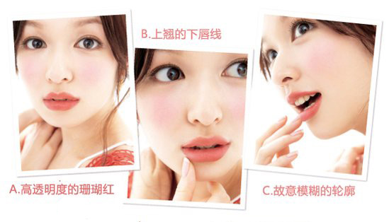 3.微翘的唇线令笑容更灿烂 在面部五官中,表情活动变化最大的应该是嘴部,“大笑、微笑、浅笑……无论怎样的笑容,配合上颜色鲜明的唇膏,一定会让你的笑容更加灿烂,更加耀眼”,中野老师认为微笑彩妆中唇彩很重要,下唇线稍稍向上翘起,即使沉默着也像是在微笑似的。 打造方法: 使用米色眼影对眼皮上妆,然后用棕色在眼角周围突出眼部轮廓。之后使用棕色眼线笔及棕色睫毛膏让眼睛看上去更柔和,大而水灵。使用粉色的胭脂膏在脸颊中心大圈的斜向上妆,颜色可以浓艳一些。唇膏选择珊瑚红,透明度要高,使用唇彩刷上妆,下唇线稍稍延长并在嘴角向上提起,上唇要将唇中涂得饱满,最后用纸巾或棉棒将多余唇膏擦去,同时让嘴唇轮廓显得模糊。 资生堂MAQuillAGE 心机彩妆臻采恒亮眼影