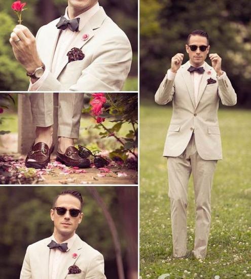 夏季的乡村婚礼充满乐趣和混搭,我们同样从 Brian Sacawa 的搭配开始,这样浅灰色系的搭配更能溶于自然;乡村婚礼的风格更为活泼,婚礼布置一般多自然木材、花草等。这时一身笔挺的黑西装可不能说自己是万能了。我们一直在强调婚礼的细节,男士不能像女士一样佩戴多种配饰,但是在婚礼上我们可以用一些心机小饰品来提亮,如果和你的新娘或是女伴一起用情侣配饰,真是高调秀恩爱的节奏。