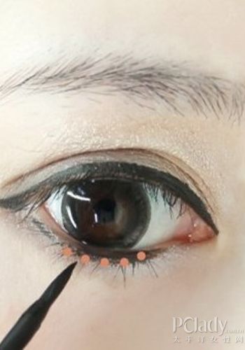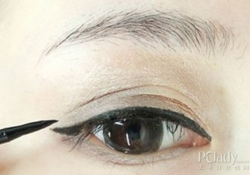 再用少许灰黑色眼影刷在下眼皮眼角部分,下眼影要与上眼影衔接好。  眼线尾部稍延伸