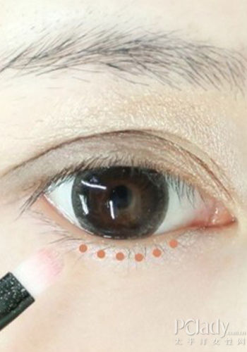 下眼皮的眼影先用白色眼影刷在眼头部分。  灰黑色眼影刷在下眼皮眼角