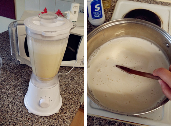 2.用搅拌机把黄豆搅成生豆浆。黄豆和水的比例差不多是1:5,也就是说要用到2500ml左右的水,因为我搅拌机没那么大容量,所以分3次进行。