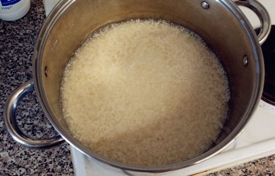 4. 把生豆浆煮熟,煮豆浆的过程中千万要随时守在锅子边上,因为豆浆浮沫里含有皂甙、皂毒素等物质,它们不但不利于蛋白消化,对人体有害,还会造成一种“假沸”现象。就是你眼睁睁看着锅里的豆浆迅速地沸腾了,然后泡沫溢出锅子弄脏了你的炉子,但其实它根本没熟。正确的煮法是,用大火(电炉6档)把豆浆煮到溢锅的程度,迅速地把浮沫撇干净(据说煮豆浆时滴几滴食用油可以防止溢锅,但我觉得用油煮豆浆很别扭,所以建议用深锅,给自己争取时间),然后用中火(电炉4档)再煮3-5分钟,让豆浆彻底熟透。PS: 其实这一步已经制成新鲜豆浆了,想喝豆浆的话可以来上一碗。