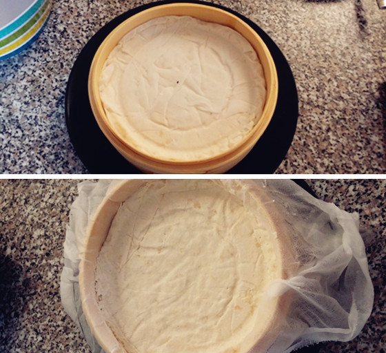 6. 让豆腐花静置30分钟,充分沉淀以后,就可以动手把它转移到滤水的容器里了,记得下面垫个盘子接水!我在蒸笼里垫上纱布,然后把豆腐花铺平,把纱布包上,上面再找重物压实,用来沥干水分,给豆腐定型。