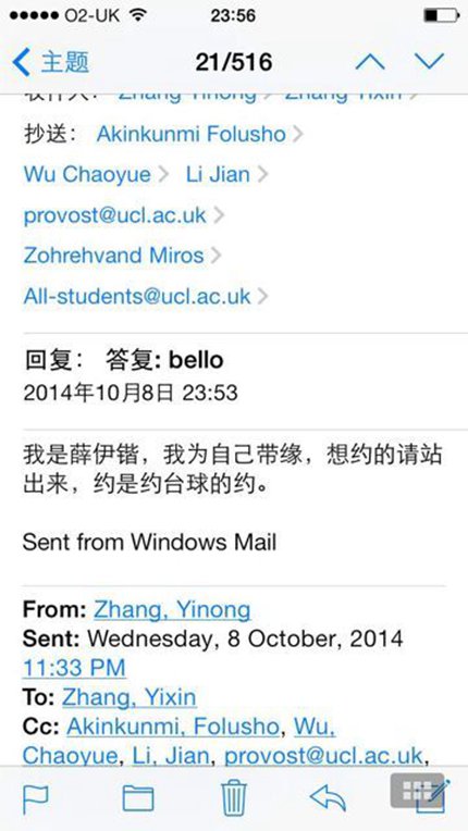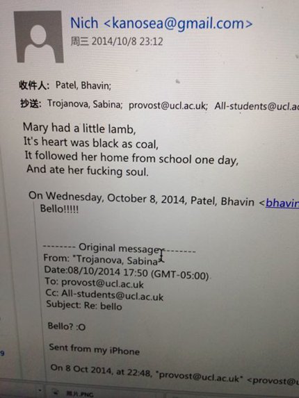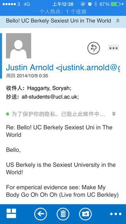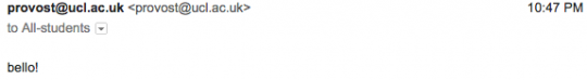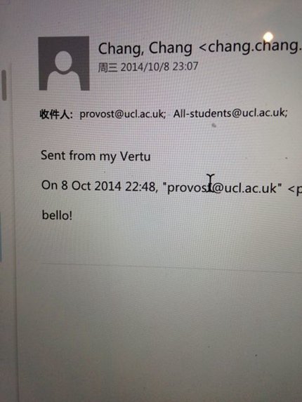 话说…. 昨天晚上我大UCL的邮件系统里上演了一场轰轰烈烈的万人大聊天的盛况。。 事情是这样的。。。 昨天晚上,UCL校长的邮箱被黑了。。。 有人用他的邮箱给所有学生发了一封邮件,邮件的内容只有一个词: Bello!!!