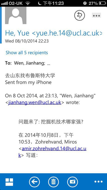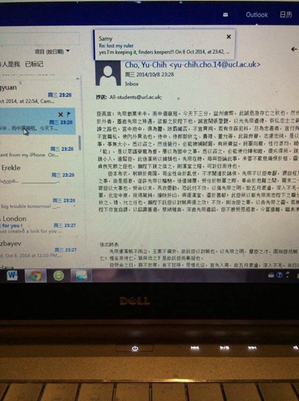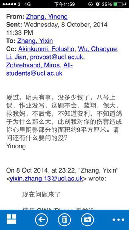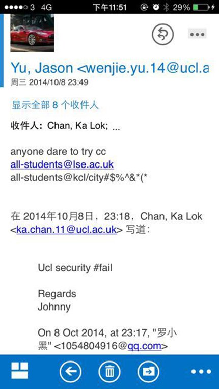 好吧… 问题在于,这封邮件发送到了一个叫 [email protected] 的邮箱…. 这个邮箱是UCL群发邮件用的专用邮箱,一般只有有权限的账号才能往这个邮箱发邮件。。。 结果,貌似昨天邮件系统出现了问题。。。 在有个哥们对校长这封邮件点了一个“reply all”之后。。。。。。