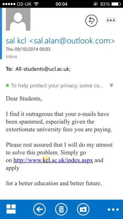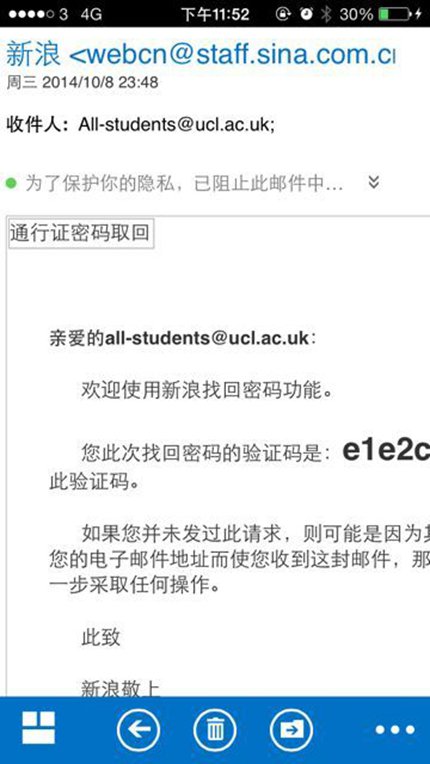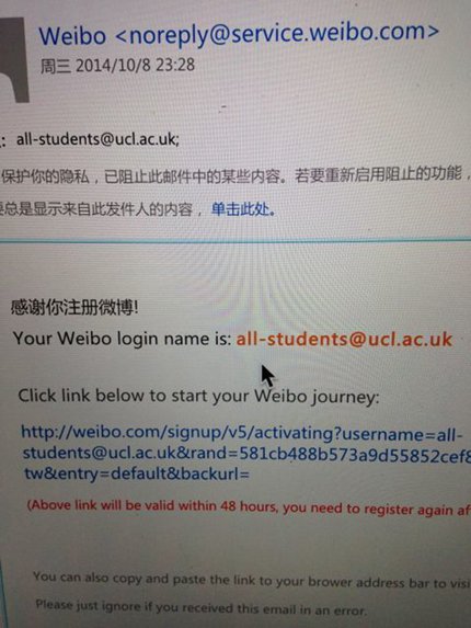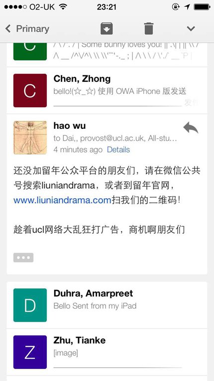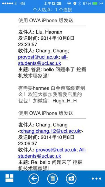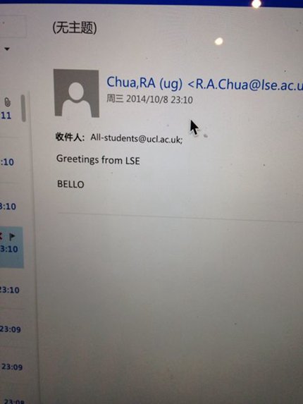 在经过头几条惊叹居然能群发的邮件之后,大家就开始玩脱了。。 暗黑童话系列。。。。。。 有人趁机用这个机会群发乌克兰的政治演讲。。。 偶尔冒出来一个土豪。。。 VERTU!!!! 隔壁LSE的也来捣乱。。。。。 KCL的同学也趁机过来挖人。。。 同学们你们好: 我知道此时此刻你们对你们邮箱被轰炸一定很愤怒,特别是还交了那么贵得学费的情况下。 相信我,我可以帮你解决这个问题,来申请我们KCL吧。 更好的教学,更好的未来。。。。 面对各种隔壁学校的挑衅。。。 UCL学生纷纷表示我们也试试看 神马的能不能也群发了。。。。。 有人开始约炮。。。。。 还真有应约的。。。。。 还有这位同学。。。。。。 各种约。。。。 大洋对岸的UC 伯克利也来插一脚。。。。。 然后微博账号的密码争夺战立刻开始了。。。。 有人趁机给自己社团打广告。。。。。
