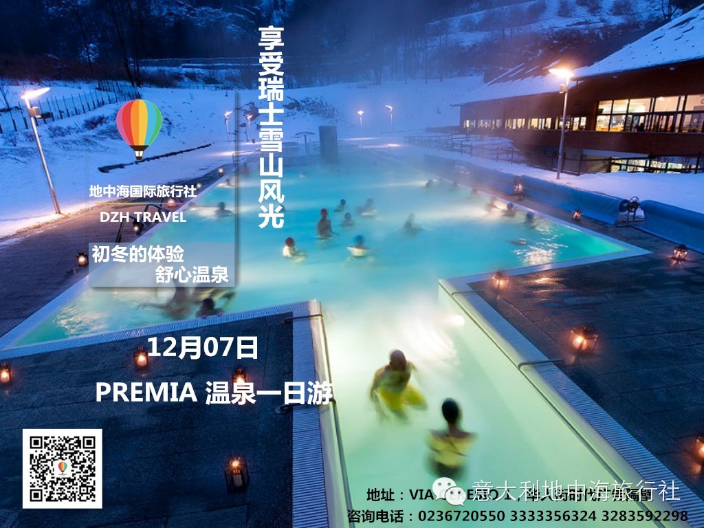 行程 星期天 12月07日 08:30 米兰华人街地中海旅行社门口出发 11:30到达莫拉斯克湖,欣赏美景 12:30出发前往温泉会馆,午餐后安排入场 18:00温泉会馆大门口集合返回米兰 预计到达米兰时间20:00 报价 60欧元每人(成人) 45欧元(3-13周岁) 3周岁以下免费 名额有限,到满团为止。 费用包含: · 往返豪华大巴车票 · 大巴保险 · 每人1瓶矿泉水 · 温泉会馆门票 · 浴袍、浴巾、拖鞋