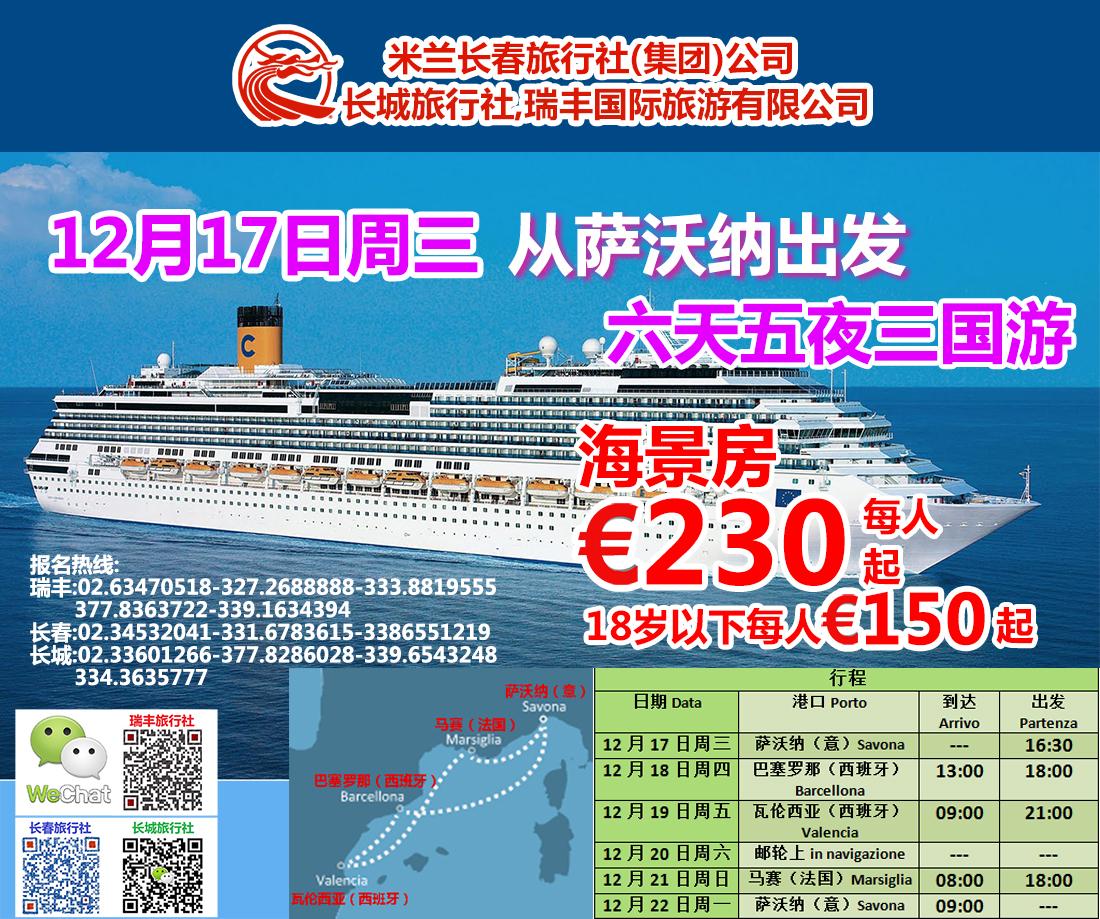 12月17日周三,歌诗达邮轮 意大利西班牙法国 六天五夜三国游 12月20日周六,MSC邮轮 加那利群岛 八天七夜豪华游 12月25,26日瑞士日内瓦,洛桑,洛伊克巴德温泉 二日游