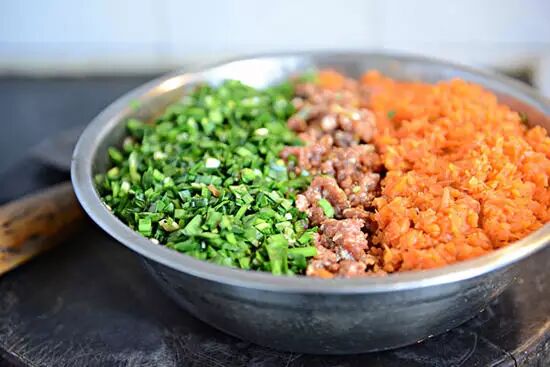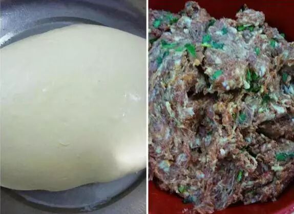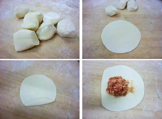 原料: 面粉200克,开水100克,肉馅150克。 制作方法: 1、面粉用开水烫成面团,揉光。肉馅加葱姜,盐、鸡精调好口味。