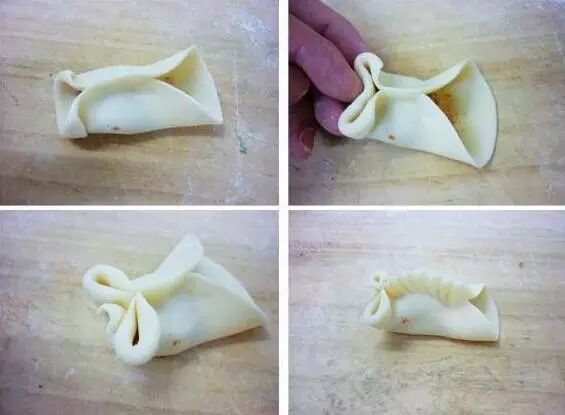 1、圆皮放上馅,对折,中间捏上,图一中黑色的线捏上; 2、图二红点对折,捏上; 3、四个耳朵... 4、中间两个耳朵折上捏好,两边耳朵往中间捏; 5、6、图5是四个耳朵的,图6是六个耳朵的... 第二种:
