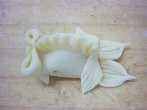 6、尾部从中间剪一刀,捏出另外两条尾巴。再剪出前鳍,这样金鱼蒸饺就做好了。