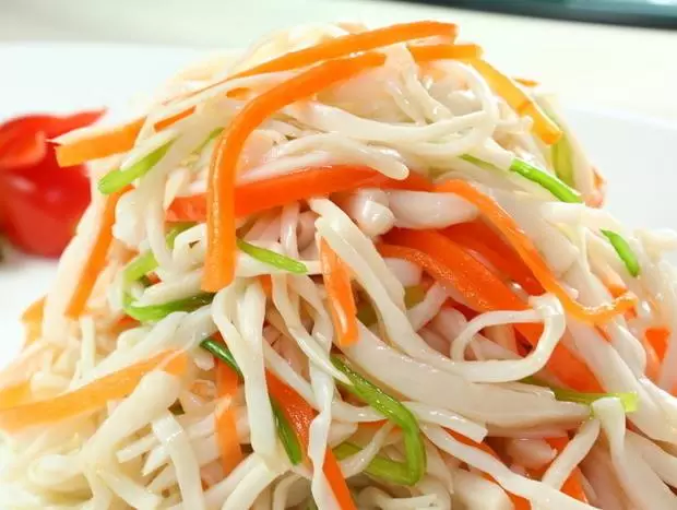 辅料:胡萝卜丝,尖椒丝,香菜末,蒜泥,花椒油,香油,盐,糖,醋。