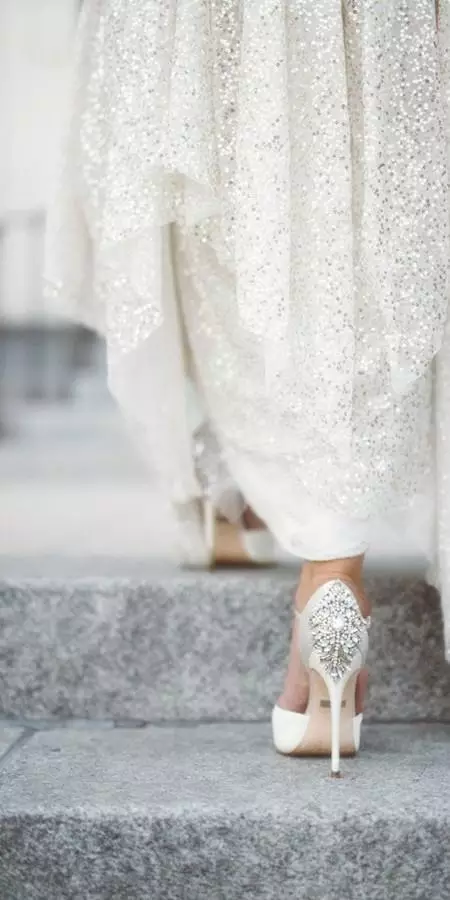 二是,千万别在婚礼当天才第一次穿婚鞋。脚会越站越肿,而且就算Jimmy Choo的水晶婚鞋也超级磨脚!所以在婚礼前几周就穿着厚袜把鞋穿松,来回练习,让它更契合你的双脚!