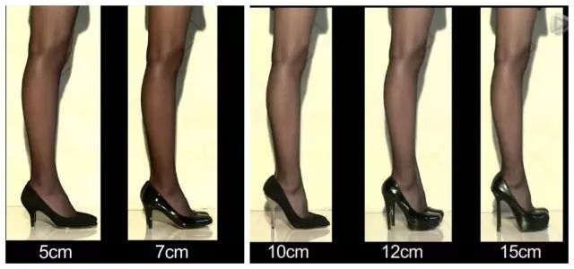 根据鞋子高度的不同,腿部线条也会有明显的区别。能看出来,穿5厘米时腿部线条没有明显变化;7厘米时,腿部线条稍有提升;10厘米则有明显提升,还能让腰线凹凸有致;而12厘米则让腿部变形,上身不由自主向前倾;15厘米就逆天了……