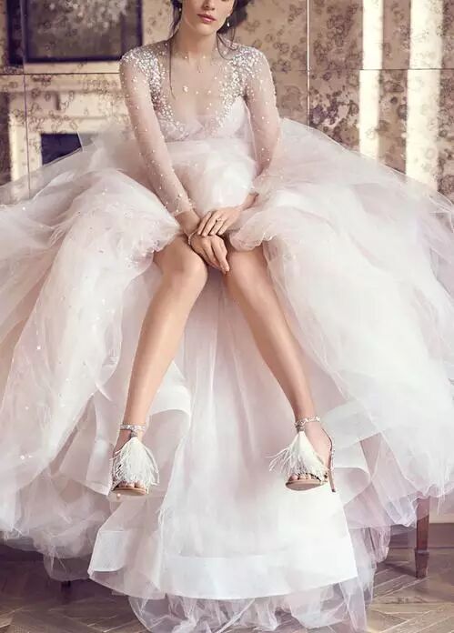 相反,如果你的婚纱是繁复的、设计感十足,或者超大裙摆的style,那么婚鞋就要尽量简洁大方、经典优雅。