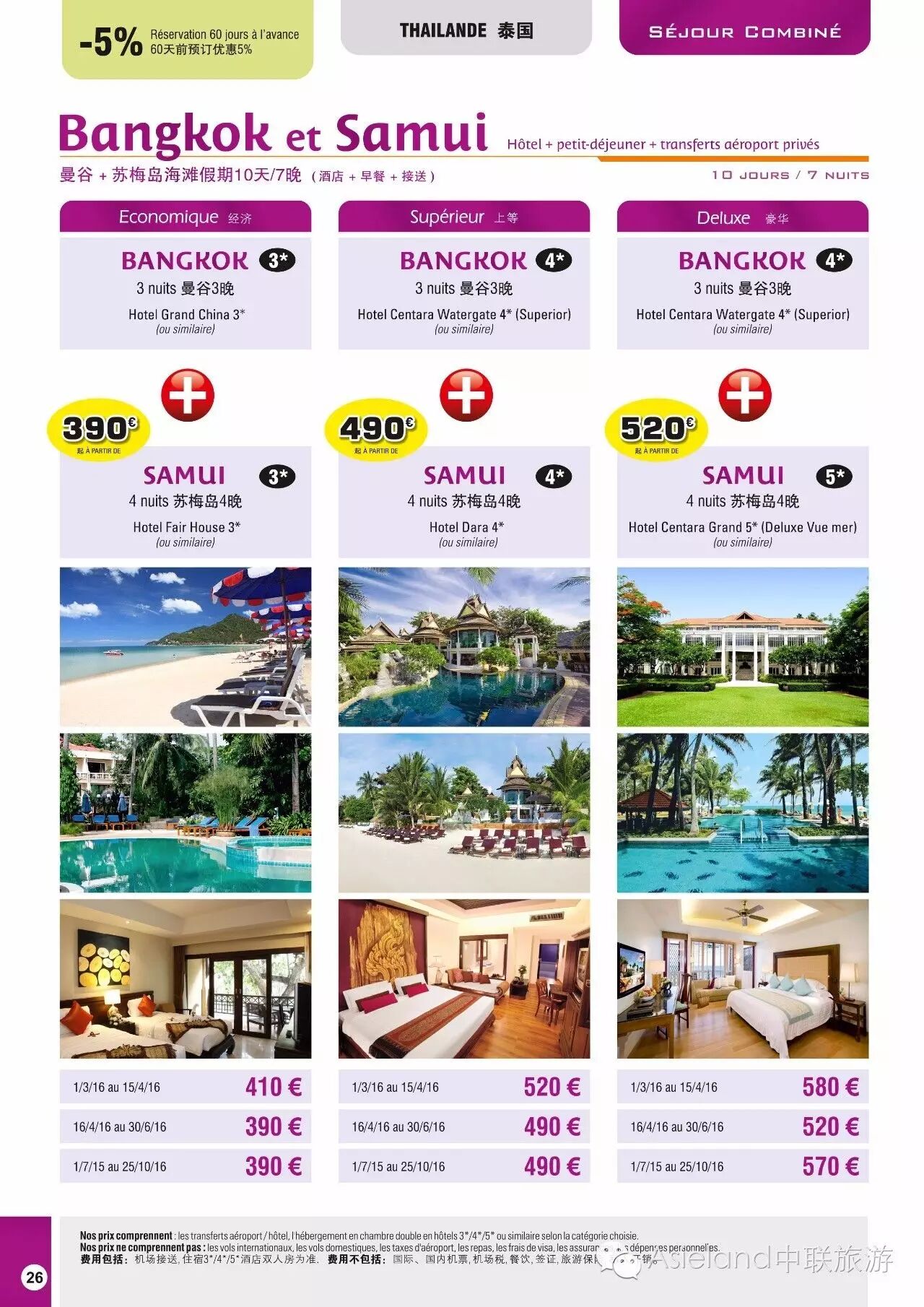 4/5星酒店 曼谷3晚(Hotel Centara Watergate 4* ou similaire) + 苏梅岛4晚(Hotel Centara Grand  5*海景房 ou similaire) Deluxe vue mer