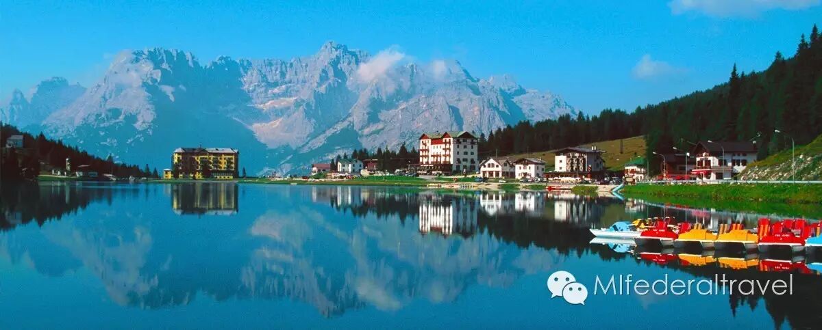 米苏里娜湖(lago di misurina)位于Cortina d’Ampezzo 东北约10km,海拔1754千米,背倚Cristallo群峰,面对Dolomiti的标志之一的三牙峰(Tre Cime di Lavaredo),群山环抱守护这颗“多诺米蒂的珍珠”,是山区最美的湖泊之一。