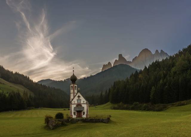 在阿迪杰河支流伊萨尔科河北岸,溪水从山上流下来走在绿油油的草原上,走在架在河面上的桥上