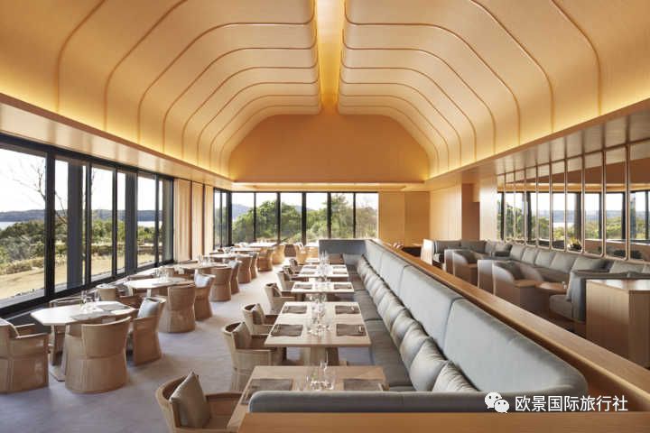 餐厅有开阔的拱顶和三面巨大的落地玻璃,周围全是大海。