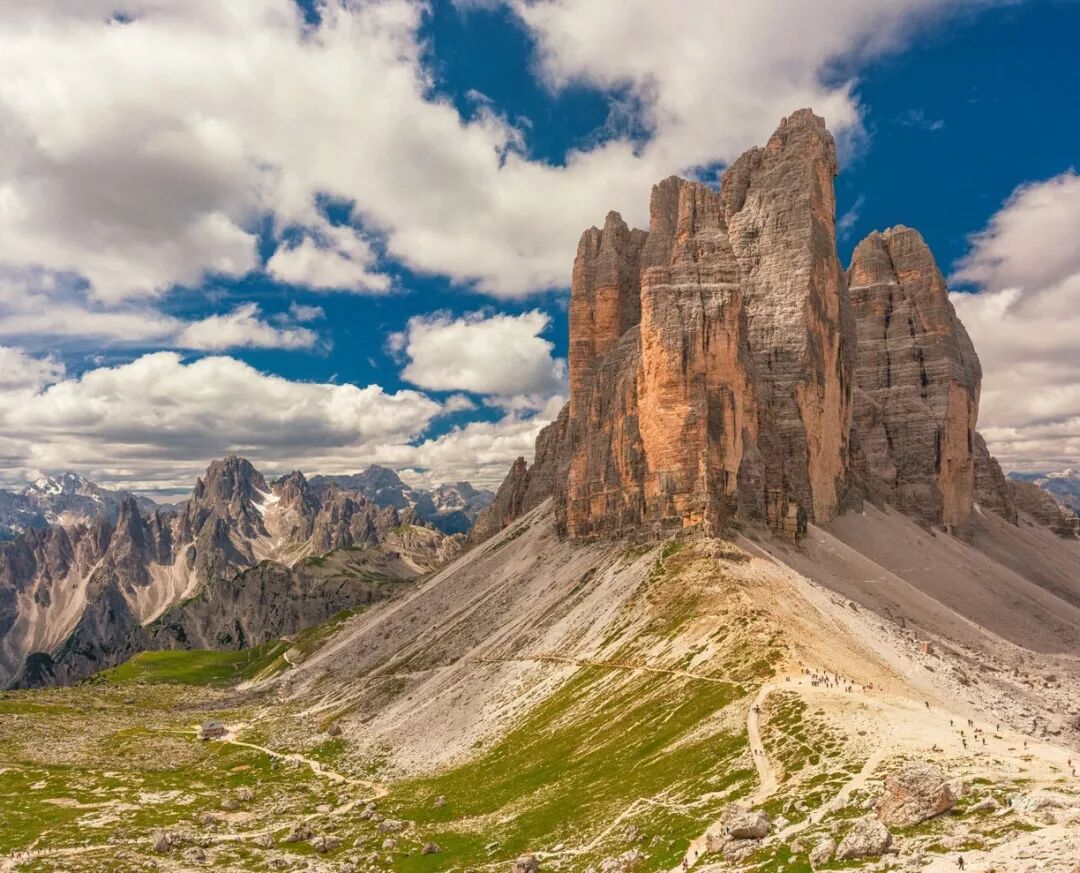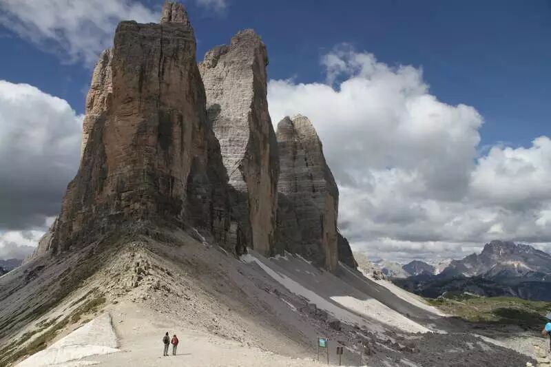 三尖峰的3个山峰,由东至西分别为Cima Piccola、Cima Grande及Cima Ovest,陡峭的直壁在平缓的草坡上拔地而起约500米,直冲云霄,外形犹如一只手掌,被当地人称之为「上帝之手」,又或是「上帝遗留在阿尔卑斯山的后花园」,因此成为了多洛米提山脉18个山峰中最热门的行山路线。而意大利著名的120公里越级越野跑赛事Lavaredo Ultra Trail,就是在多洛米提山脉内举行,当中又以三尖峰为整个赛事最精华的部分。