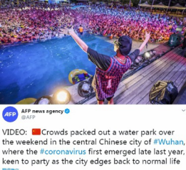 8月17日,法新社在推特(Twitter)上视频、图、文三连发,以“武汉音浪”(Wuhan Wave)为开头,报道了武汉一家水上乐园举行2020年电子音乐节的盛况。