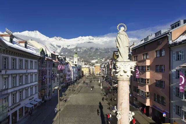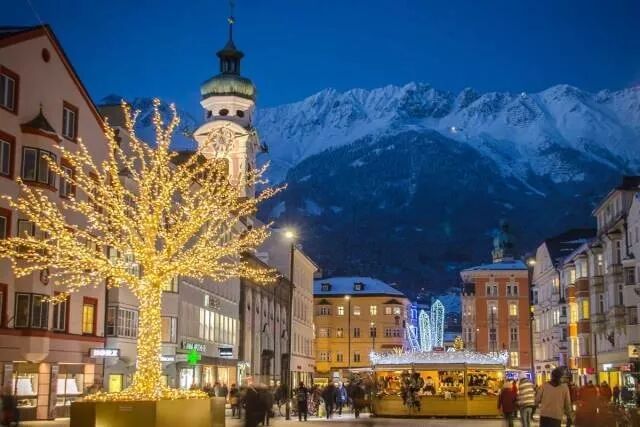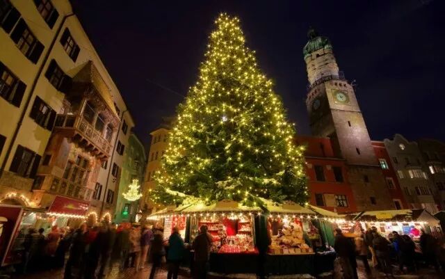 因斯布鲁克建立于1239年。这座美丽的小城坐落在阿尔卑斯山谷之中,旁边流淌着因河。 奥地利的高山,就跟她的音乐一样,是世界知名的。蒂洛尔州则是阿尔卑斯山的心脏。无论是在因斯布鲁克的哪一个角落,都能见到白雪覆盖的山峦。因为北面被山脉遮挡,所以因斯布鲁克气候宜人,是国际旅游的胜地。因斯布鲁克圣诞集市是整个阿尔卑斯山地区最美丽,最浪漫的集市之一。老城前的中世纪广场著名的黄金屋顶,简直就是传统圣诞市场绝佳的布景。 在白雪皑皑的群山环绕下,圣诞市场崇明当地独特的传统韵味,游客可品尝传统的炸面包圈,热葡萄酒,雷柏姜饼和各种风味的地方小吃。