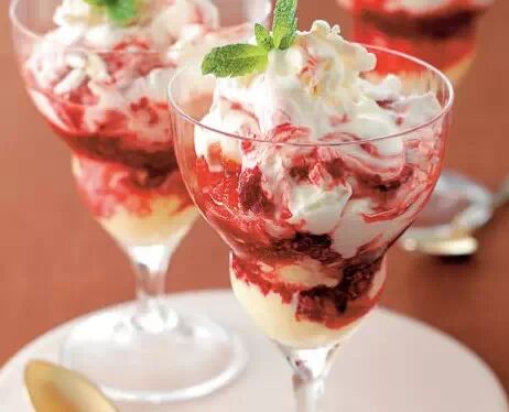 奶油,莓类水果(草莓,红莓,蓝莓都行)和Meringues(就是鸡蛋白加糖用打蛋机打出来的,然后再用烤箱低温烤干),比较甜。