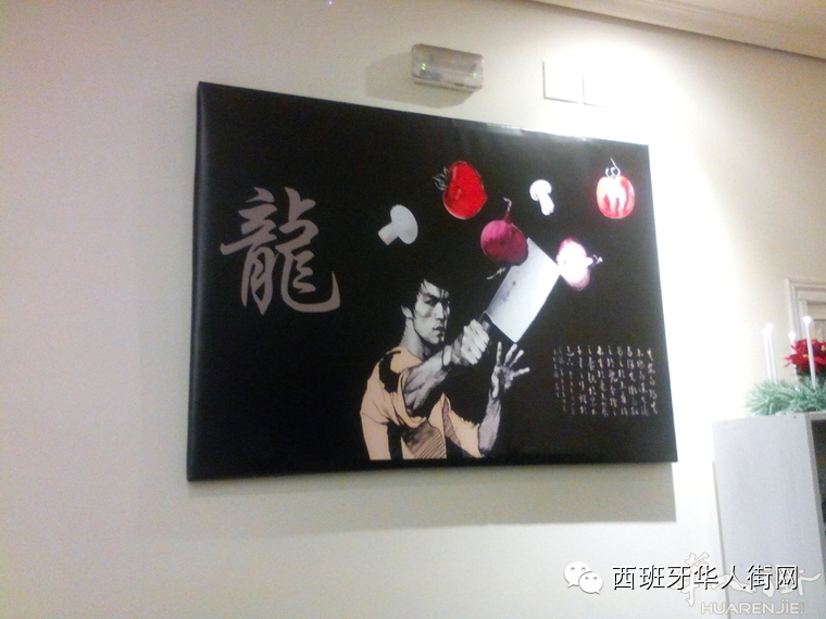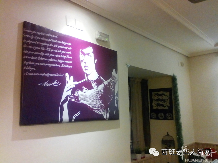 《功夫餐厅》真的非常好找,它就在Gran Via 大街,如果你是从Plaza de España下站;你只需要往Callao电影院方向走然后拐进Calle de Concepción Arenal街,那里有个小plaza(广场)《功夫餐厅》就在Calle de la Luna第12号就是了。如果你是在Callao下站;那你往下走,然后向右拐进C/Concepción Arenal (同上)就是了。如果你还是找不到!那么我告诉你!路痴!你没救了! 餐馆的装饰非常优雅,四面八方的墙壁上挂着中国一代宗师李小龙的画像让人有种不知名的亲切感。餐厅的面积不是很大,位置也不是很多,可就是因为这样~给了进入餐馆进餐的食客们一种温暖的赶脚。(其实吃了辣之后你不想温暖也得温暖!哈哈)