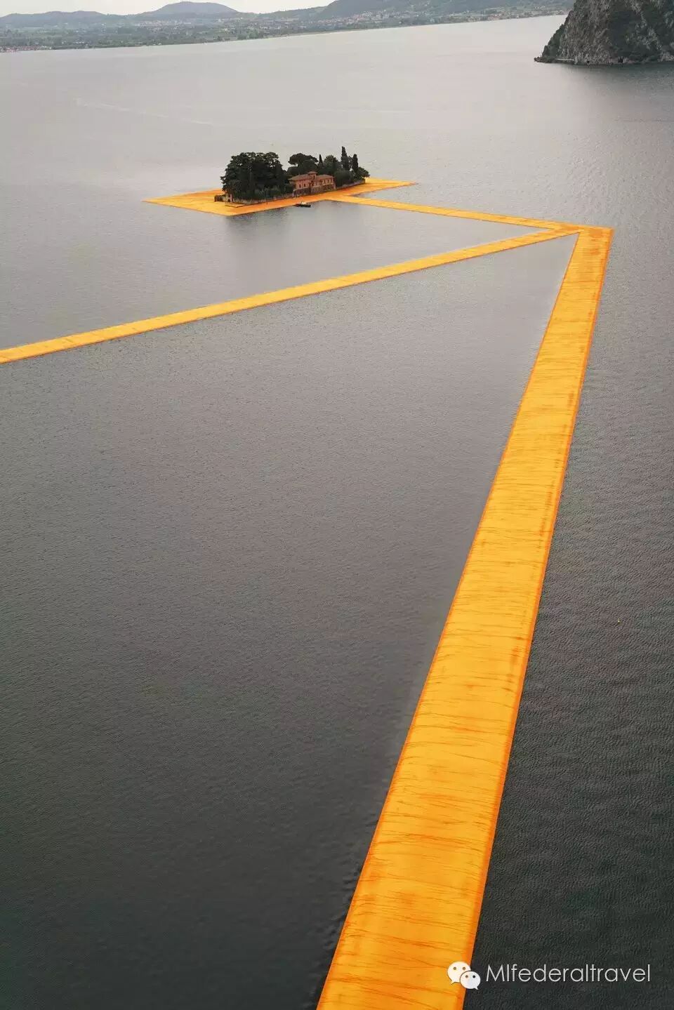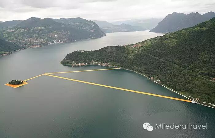 凌波之旅:2016六月,200,000块高密度聚乙烯方体将被连接在一起,形成面积高达70,000平方米的浮桥装置,为意大利北部伊塞奥湖区增添一抹亮丽的风采。这个由Christo设计,16米宽,50厘米厚的浮桥系统总长3公里,游客们将在随着波浪微微摇摆的浮桥上漫步前行,从湖畔的小镇Sulzano到达Monte Isola再前往被浮板所环绕的小岛San Paolo。蜿蜒曲折步行系统的引导着人们从不同的角度欣赏这美丽的湖光山色。而登上环绕湖区的山脉,则可从空中俯瞰这道独特的风景线。而亮黄色的桥面布料也将延伸进入城市,覆盖Sulzano和Peschiera Maraglio1.5公里的步行街道。