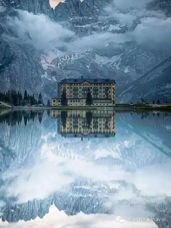 米苏里娜湖(lago di misurina)位于Cortina d’Ampezzo 东北约10km,海拔1754千米,背倚Cristallo群峰,面对Dolomiti的标志之一的三牙峰(Tre Cime di Lavaredo),群山环抱守护这颗“多诺米蒂的珍珠”,是山区最美的湖泊之一。