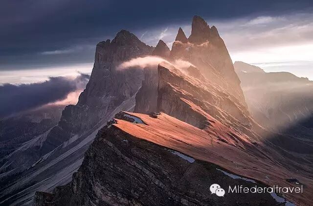 三牙峰(tre cime di Lavaredo)位于多洛米蒂山脉德国意大利边境,值得近距离观赏的神奇山脉。亿万年前这里都是海底珊瑚,后来沧海桑田,慢慢演变成为今天巨大山峰。最大的一座山峰正午时看起来颇为苍白,傍晚时却隐隐放出一种粉色光芒,峰尖错诡奇,而另外两座高峰则摩天劈地,威仪雄踞,各有动人之处。