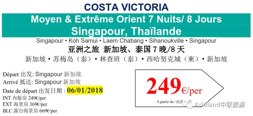 [旅游包车/地接] Costa Victoria新加坡、泰国7晚/8天游低至249欧起