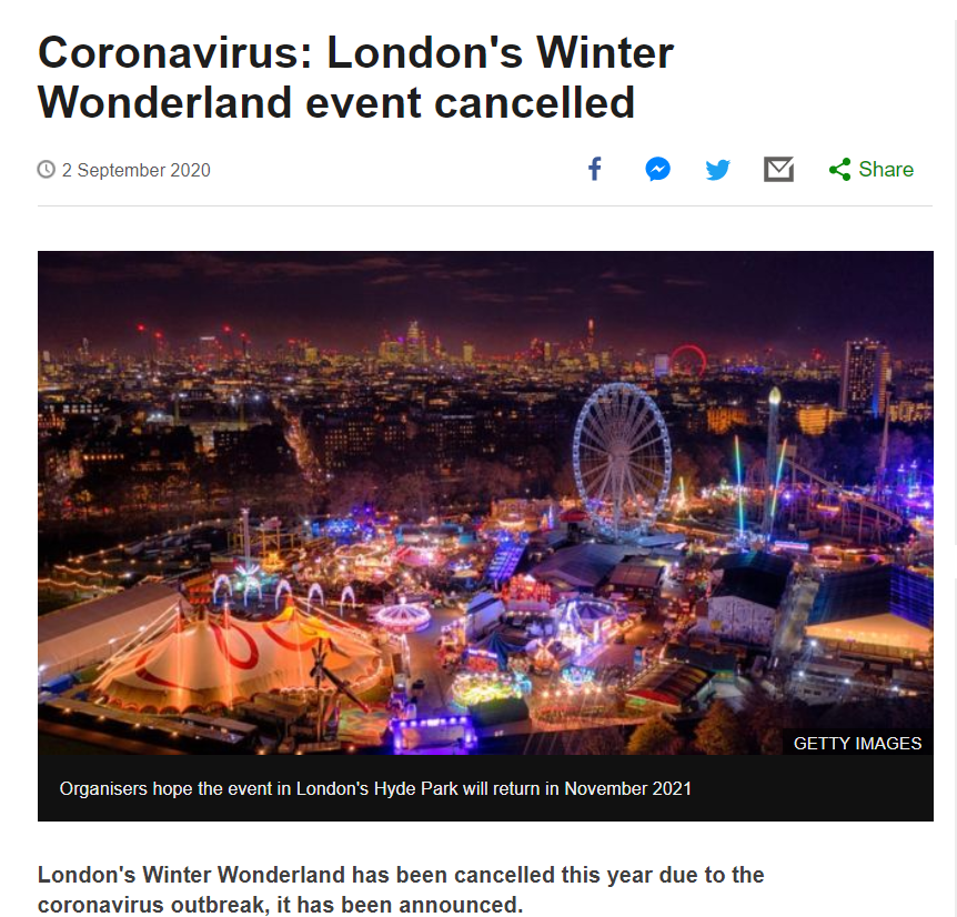Winter Wonderland确认取消一年一度的盛会始于2007年,当时是海德公园的圣诞节市场,此后随着溜冰,表演和过山车之旅的规模而扩大。 由于“持续的健康问题和旅行限制”,组织者表示,他们别无选择,只能取消它。 希望Winter Wonderland在2021年11月回归。 在Winter Wonderland网站上发表的声明说,这一宣布“令人沉痛”。