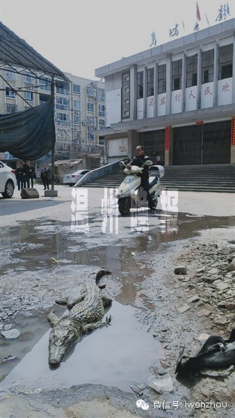 都没有反应 原是死鳄鱼 当天早上9时许,家住马屿电影院对面的陈女士,看到了这条鳄鱼。陈女士说,当天早上9点多,她从菜场买完菜回家。快到家时,她看到电影院前站满了人,好像在看什么稀奇的东西。于是,她就走向前去看看,当探头往人群里一看时,惊呆了,路边的小坑里居然躺了条鳄鱼。