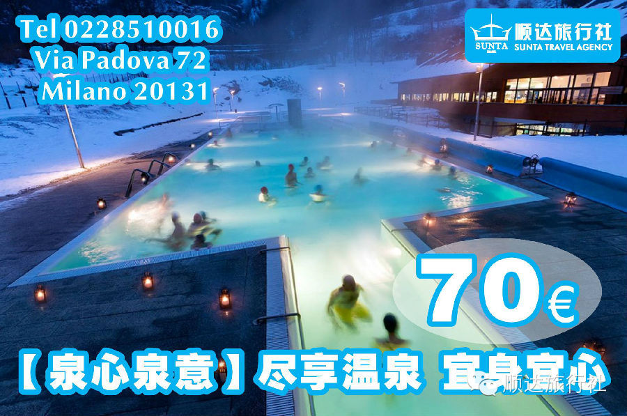 「温泉」-我们美丽地球的热泪,是大地赐予人类宝贵的礼物,是从地底涌出的天然热水,自古以来即被人们作为养生与水疗的天然资源,人类利用温泉水疗来做养生保健的工作,已经有很久的历史了。 该温泉会馆具有现代化和天然融为一体的场所,在海拔高度800米以上,依山而建,总规划面积2,6万平方米。它位于迷人的阿尔卑斯山谷之中,周边是风光明媚的山林乡野。有别于以往,该温泉会馆对温泉的开发与利用更上一层,为传统的泡汤注入新的健康养生概念,现代温泉玩法可以说是五花八门,它具有温泉水疗,温泉游泳池,温泉按摩,温泉桑拿应有尽有。增购了现代化,科技化的温泉硬体设备,将单纯泡汤观念转为温泉水疗。让人们不仅可以享受传统的泡汤乐趣,还在享受的同时达到了健疗的效果。特别值得一提的是宽敞的温泉游泳池,出水温度高达44℃,水池的温泉水温保持在32℃—36℃之间,水质晶莹滑爽,含有对人体健康有益的微量元素,是一种罕有的硫酸钙高温矿泉,含量为1414毫克/升,享有“返老还童泉”之美誉。除了促进新陈代谢的功能之外,还被强烈推荐用于烧伤或疤痕和皮肤抗衰老治疗。温泉水的抚慰和洗涤效果还非常适合某些形式的湿疹,皮肤和牛皮癣发红。如此罕见的保健温泉水,常以泉洗浴,对治疗皮肤病、胃病、关节炎、精神衰弱等疾病有较好的疗效,还有延缓衰老、延年益寿的神奇妙用。 古装影视剧中,大侠或仙人的标配活动场所往往都选在瀑布旁边。对于中国人来说,瀑布不仅仅是一个自然景观,更是一种神圣信仰的载体。连诗仙李白都惊叹于瀑布的魅力,“飞流直下三千尺,疑是银河落九天”,千古名句成了瀑布的最佳广告词。多切瀑布是欧洲第二高的瀑布,落差达143米。在瀑布的上端有一座著名的的装饰艺术风格酒店,建于1923年,在那里可以尽情欣赏瀑布的全景。 来吧!和顺达一起想泡就泡!让我们远离城嚣,享受温泉区的湖光山色,大自然的虫鸣鸟叫,以及森林芬多精的洗礼,达到休闲与健康的双重效果。 服务范围 : 机票预订、旅馆预订、租车业务、 旅游服务、机场接送、MSC游轮、 陪同翻译、… 地址: Via Padova 72, Milano 20131