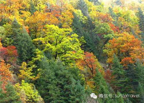 阿坝州黑水县的红叶彩林,绝对是秋日川西地区最值得欣赏的景色。红叶彩林隐藏于清幽雅静的深谷中。整个彩林全长八十里。充足的阳光将秋日的山林照射出一道道光芒。各种桦树、柏树、枫树和乔木林带着各种不同色彩点缀山野。密密麻麻的覆盖了一座山坡又一座山坡。