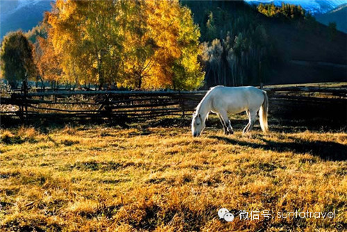 在神的后花园——禾木,每年秋天是最美的时刻,草原渐入金黄。“林中的仙女”白桦树开始由绿变黄,与山中的雪松、翠柏、枫树等等一起转换成五彩的林带。村落中的牛羊自顾自的吃草散步,即使是抬头懒懒的看你一眼,也显得那么无视。